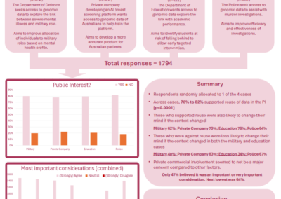 The research team conducts extensive and collaborative work in the field of genomic data governance, exploring the ethical, legal, and social dimensions of how genomic information is collected, stored, used, and shared. Our interdisciplinary focus enables us to examine complex questions about a wide range of concepts and issues. Our publications contribute to national and international debates on responsible genomic data governance. These outputs both generate knowledge and also inform practical policy and governance to support ethical and socially responsive genomic science.