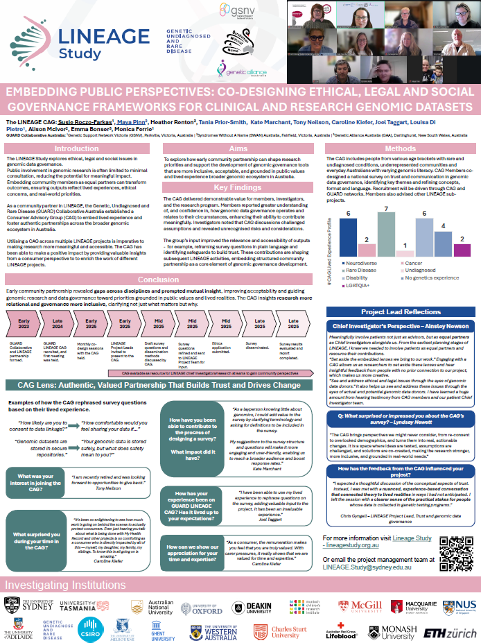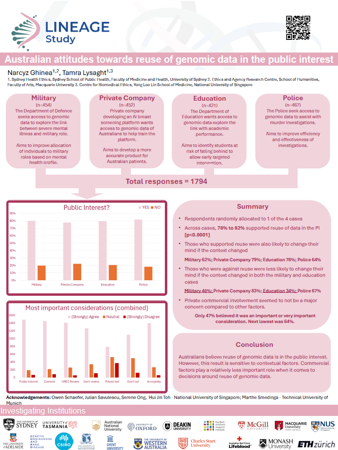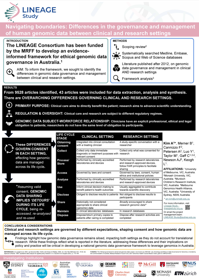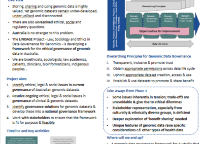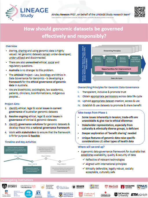 Researchers from the LINEAGE Study regularly present posters at national and international workshops, conferences and symposia. These posters showcase emerging findings, conceptual developments, and ongoing work across the project’s diverse research streams in genomic data governance.